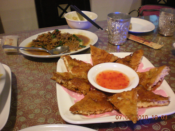 蝦醬空心菜、咖哩雞、月亮蝦餅(原本點金錢蝦餅,但今日未供應)、青木瓜沙拉、打拋牛肉─→ 口味小辣